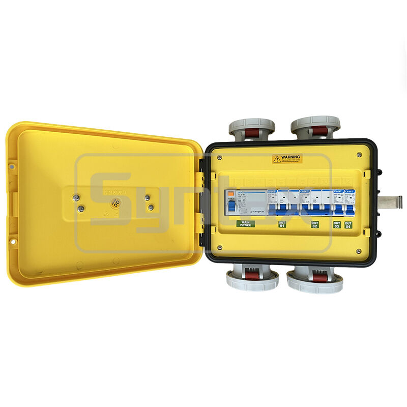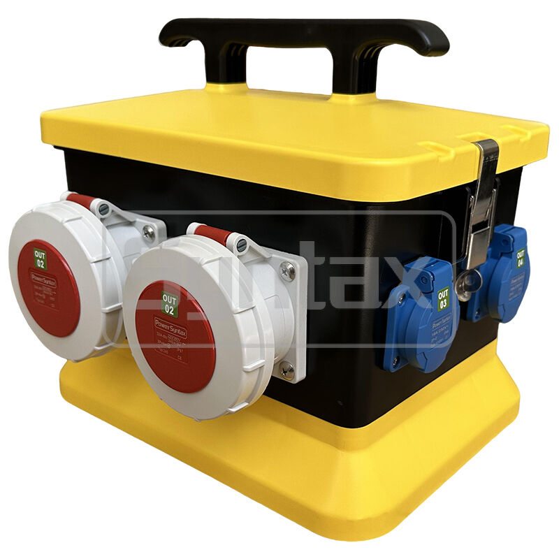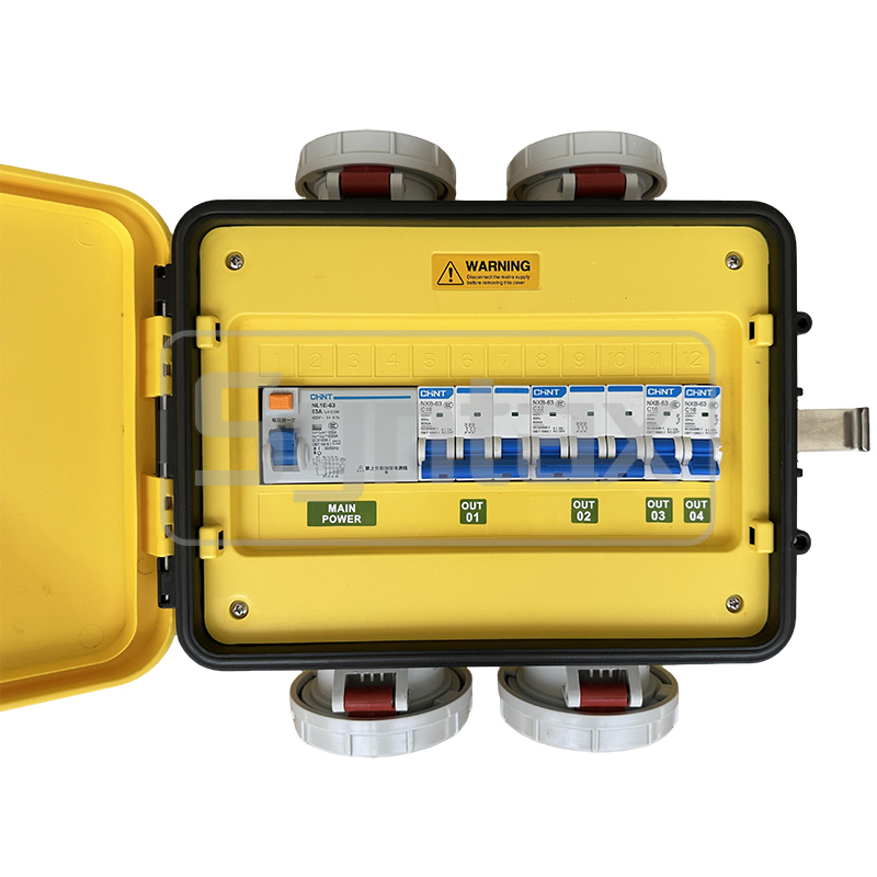 Este quadro de distribuição portátil padrão CEE para uso em Eventos ao Vivo, Eventos Esportivos, Cinema e TV, tem classificação de 63A, 400VAC, 3P+N+E IP67 à prova d'água. A entrada de entrada é 5P 63A 400v trifásica IP67, que é protegida por um DR 4P 63A 30mA/DR/RCD. As tomadas de saída são 2 tomadas retas montadas em painel 5P 32A 400v IP67, protegidas por 1 disjuntor 3P 32A, e 2 tomadas retas montadas em painel 5P 16A 400v IP67, protegidas por 1 disjuntor 3P 16A, e 2 tomadas Schuko (tipo alemão) monofásicas 2P+E 220v 16A, protegidas por 2 disjuntores 1P 16A. As caixas são feitas em PC e IP67 à prova d'água, o que é perfeito para eventos, especialmente para palco. Podemos personalizar quadros de distribuição de energia construídos sob encomenda.