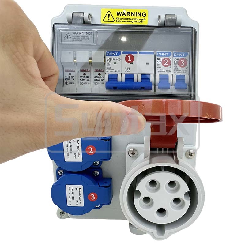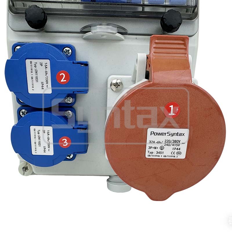A caixa de distribuição 32 AMP trifásica montada na parede é feita em material de PC em tipo montado na parede, lá- Não.As tomadas de saída são tomadas IP44 de 400V, protegidas por MCB de 3P 32A,e 2 números 16A/2P+E 220v IP44 Soquetes SchukoTodas as placas de distribuição de energia são construídas sob encomenda.