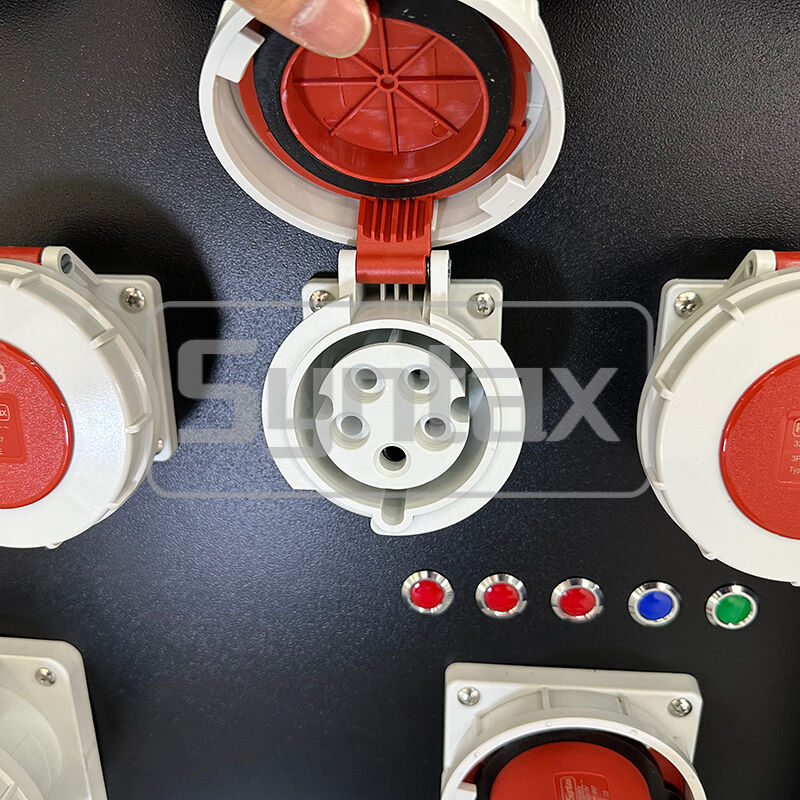| Saídas 7-12 | 6 × Tomadas Montadas em Painel 3P 32A 220V IP67, Protegidas por 6 × DRs (RCBOs) 1P+N 32A 30mA |