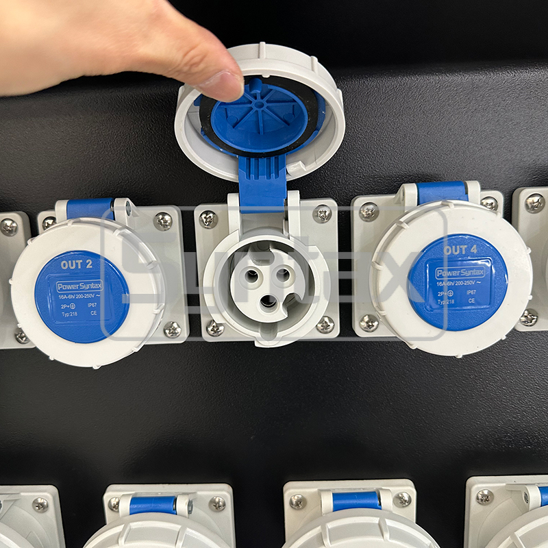 | Saídas 1-6 | 6 × Tomadas Montadas em Painel 3P 16A 220V IP67, Protegidas por 6 × DRs (RCBOs) 1P+N 16A 30mA |