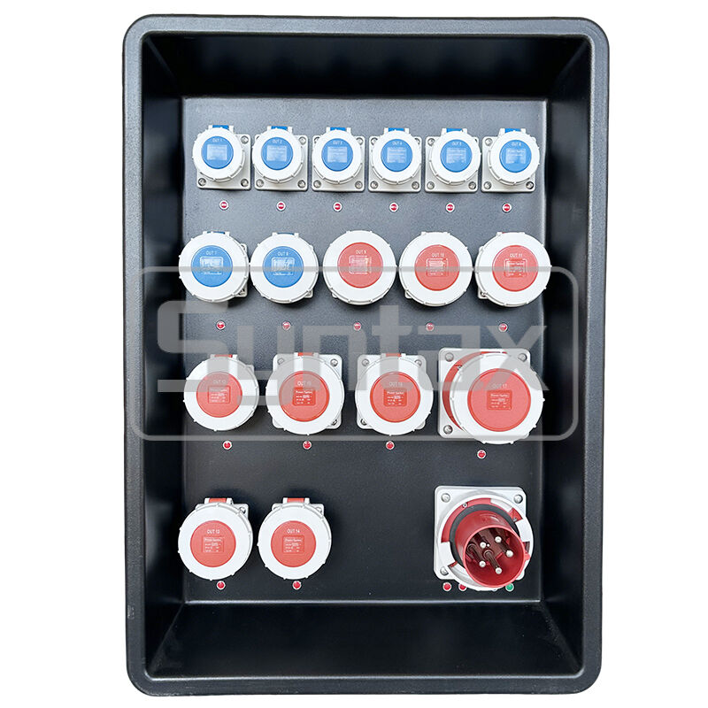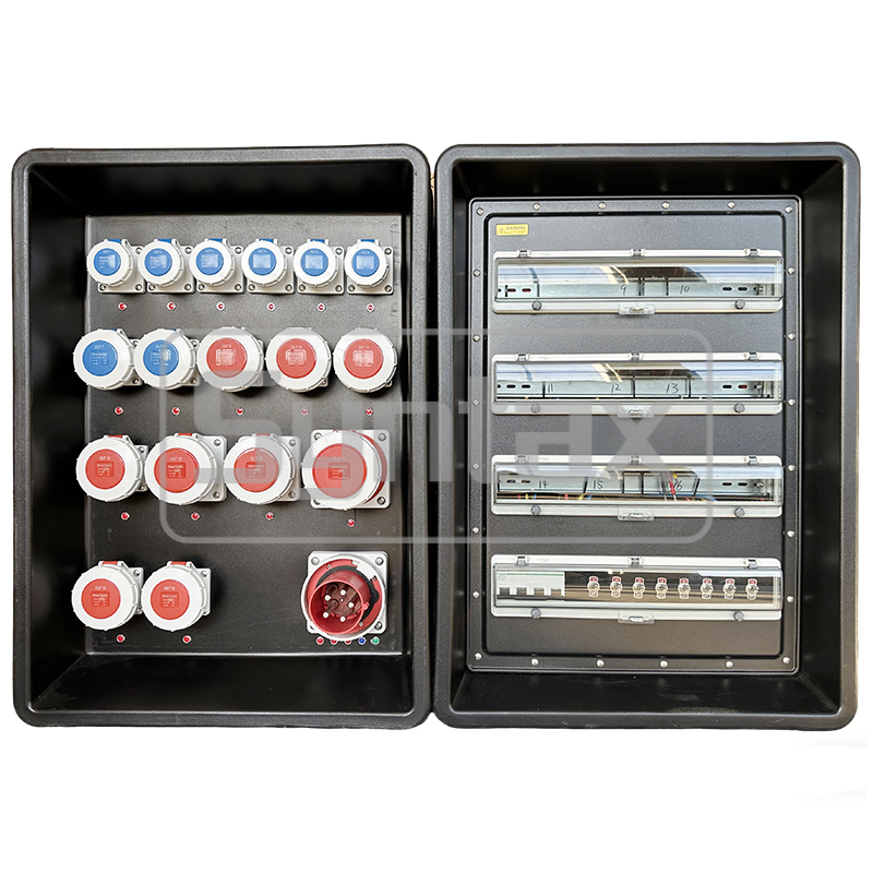 | Outgoing 15-16 | 2 × 5P 63A 400V Soquetes IP67 montadas em painel, protegidas por 2 × 4P 63A MCBs + 2 × ELRs, com 2 × interruptores de ligação |